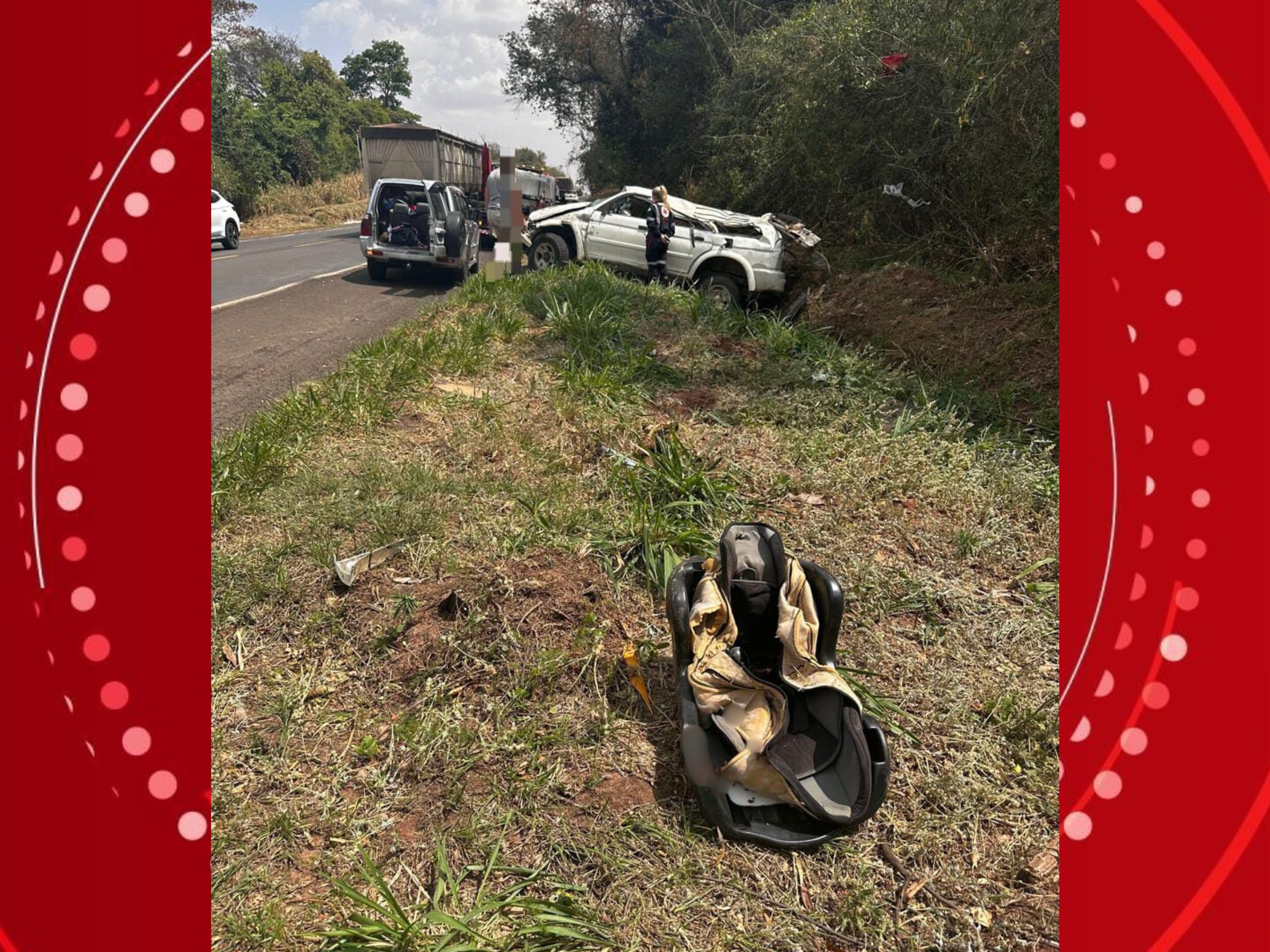 Acidente aconteceu na BR-376, em Paranavaí, na manhã deste domingo (21). Quatro pessoas ficaram feridas. Uma criança de dois anos morreu após o carro em que estava capotar na BR-376, em Paranavaí, no Noroeste do Paraná, na manhã deste domingo (21). De acordo com a Polícia Rodoviária Federal (PRF), a cadeirinha em que ela estava foi ejetada do veículo durante o acidente. Quatro pessoas ficaram feridas, incluindo a condutora de 30 anos, duas passageiras de 33 e 50 anos e uma criança de cinco anos. Criança de dois anos morre após cadeirinha ser ejetada de carro em acidente no Paraná — Foto: PRF Uma criança de dois anos morreu após o carro em que estava capotar na BR-376, em Paranavaí, no Noroeste do Paraná, na manhã deste domingo (21). De acordo com a Polícia Rodoviária Federal (PRF), a cadeirinha em que ela estava foi ejetada do veículo durante o acidente. Ainda conforme a polícia, o carro saiu da pista e, atravessou a rodovia e, em seguida, capotou. Quatro pessoas ficaram feridas, incluindo a condutora de 30 anos, duas passageiras de 33 e 50 anos e uma criança de cinco anos. Todas foram encaminhadas em estado grave para a Santa Casa de Paranavaí. A PRF investiga as circunstâncias do caso. No momento do acidente, a pista estava seca e informações preliminares indicam que todas as vítimas eram da mesma família. ASSISTA TAMBÉM: Temporal derruba estrutura no Autódromo de Cascavel durante evento de corrida VÍDEOS: Mais assistidos do g1 Paraná Ops!