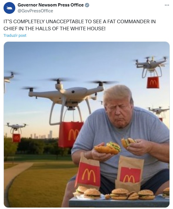 Secretário de Guerra assina ordem que prevê demissão de militares acima do peso; governador da Califórnia reage com montagem de Trump comendo sanduíches Governador da Califórnia ironiza peso de Trump após secretário de Guerra ameaçar ‘generais O que muda para os militares Militares ativos passarão por dois testes de aptidão física anualmente.Reservistas e membros da Guarda Nacional farão um teste anual.Serão medidos altura e circunferência da cintura.O padrão aceitável será divulgado em até 60 dias.Quem não atingir os índices será colocado em programas de “remediação”.Aqueles que não conseguirem emagrecer podem ser punidos, inclusive com demissão.Líderes também serão responsabilizados se não aplicarem as regras.Barbas também serão proibidas. Apenas bigodes bem aparados serão permitidos, desde que não interfiram na vedação de máscaras respiratórias. Exceções poderão ser feitas por motivos médicos, religiosos ou em missões específicas. Os limites oficiais de circunferência da cintura ainda serão publicados pelo Pentágono nos próximos 60 dias. No memorando, Hegseth afirmou: “É completamente inaceitável ver generais e almirantes gordos nos corredores do Pentágono. A era da aparência pouco profissional acabou”. Apoio de Trump e reação da oposição Trump demonstrou apoio pelas medidas anunciadas por Hegseth: “Se você não gosta do que estou dizendo, pode sair da sala. Lá se vai sua patente, lá se vai seu futuro. Tudo se baseia no mérito”, disse. A oposição reagiu com ironias. O governador da Califórnia, Gavin Newsom, publicou no X (antigo Twitter) uma montagem de Trump comendo sanduíches e escreveu: “Acho que o Comandante em Chefe precisa ir embora!” ‘É completamente inaceitável ver um comandante-chefe gordo nos corredores da casa branca.’ — Foto: Reprodução/X O perfil oficial do partido Democrata postou apenas uma imagem do presidente Trump em resposta a uma descrição do discurso do secretário com o comentário “Isso é interessante”. Mudanças no Pentágono A nova política faz parte de uma série de mudanças no Pentágono desde o retorno de Trump à Casa Branca. O presidente rebatizou o Departamento de Defesa como “Departamento de Guerra” e passou a adotar medidas consideradas rígidas para reforçar a disciplina militar. Secretário de Trump critica ‘generais gordos’ e diversidade nas Forças Armadas Ops!